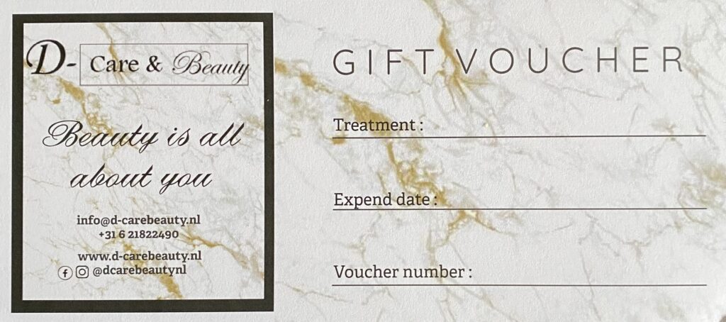 Als u een cadeaubon wilt kopen kunt u deze bestellen d.m.v. een mail te sturen naar info@d-carebeauty.nl of een whatsapp bericht te sturen naar 0621822490. Elke behandeling en/of elk bedrag is mogelijk.